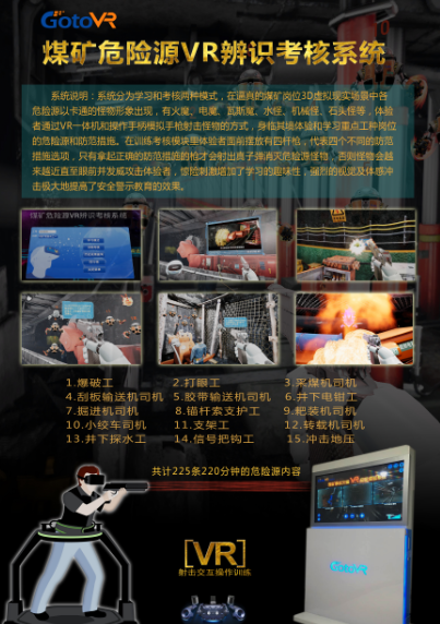 煤礦崗位危險(xiǎn)源VR辨識(shí)訓(xùn)練系統(tǒng)是嚴(yán)格按照國(guó)家《煤礦安全規(guī)程》和《煤礦安全操作規(guī)程》的細(xì)則要求和多家大型煤礦企業(yè)生產(chǎn)實(shí)際總結(jié)提煉出來的,目前對(duì)16個(gè)煤礦重點(diǎn)崗位工種系統(tǒng)地進(jìn)行了辨識(shí),共有236個(gè)常見危險(xiǎn)源,對(duì)每個(gè)危險(xiǎn)源的發(fā)生過程及防范措施都做成了VR視頻的方式,便于直觀的學(xué)習(xí)掌握。